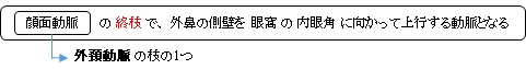 顔面動脈と眼角動脈の境界線がはっきりとしない。「 日本人体解剖学 」では、眼角動脈が吻合する動脈として眼窩下動脈を含めていないので、吻合する枝を出す上部より眼角動脈としていると思われる。それに対して、「ウィキペディア」では、他の動脈との吻合に眼窩下動脈を含めている。まあ、それほど厳密に区分する必要もないのかもしれないが…。