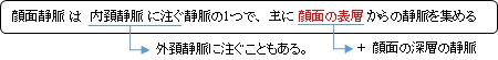 「 深在 + 浅在 」: 顔面静脈は深在および浅在の静脈から静脈血を受ける。深在の静脈は翼突筋静脈叢を起始とし、浅在の静脈に合流する形を取る。