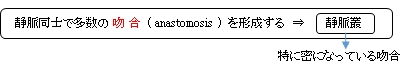 上記の 肺循環 (pulmonary circulation) を 簡単に表した図を見て分かるように、全身からの静脈は心臓の 右心房 (left atrium) に、そして肺からの静脈は 左心房 に入ることになる。 浅静脈と深静脈は多数の吻合によって連結されている。吻合枝内での血液の流れは必要に応じて血圧の高い方から低い方に流れ、それはある場所では深層から表層に、またある場所では表層から深層への血流になっている。 特に密になっている吻合を静脈叢と言い、圧迫を受けやすい部位に見られる。 ⇒ 静脈叢一覧