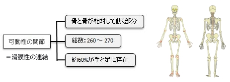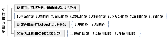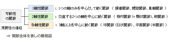 関節は、ほとんど動きを伴わない「不動性の関節」と動きを伴う「可動性の関節」(狭義の意味での関節)に大きく分けることができる。