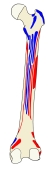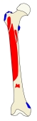 「船戸和弥のホームページ」には以下のような解説が見られる。 「大腿骨は人体で最長の管状骨で約40cmあり、身長のほぼ1/4を占め、前方に軽く凸弯している。」 大腿骨は中央の大腿骨体と近位の端(近位端/上端)、そして遠位の端(遠位端/下端)の3つに区別することができる。 「プロメテウス解剖学アトラス解剖学総論/運動器系 第2版 「軸のアライメントが正常な個体では、下肢の大きな関節(股関節、膝関節、距骨関節)が一直線上にあり、その軸は下肢を縦走する荷重軸(ミクリッチ線)にあたる。 以下の文章は「日本人体解剖学」(南山堂)からの引用文となる。 「発生:大腿骨の骨化は胎生7週の終り頃に始まる。遠位骨端の骨化点は胎生末期に現れ、この部位の骨化が法医学的に胎児と新生児の判定に応用される。近位骨端の骨化点は生後間もなく現れる。そのほか、大、小転子、内、外側顆にも骨化点が現れる。骨端と骨幹との癒合は20~25歳ころに行われる。