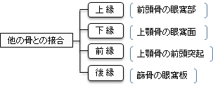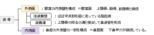 涙骨には以下の4つの縁があり、それぞれ他の骨と接している。 【その他】 「日本人体解剖学 (上巻) 「発生:涙骨は、軟骨性鼻嚢の外面にそって発生する結合組織性骨で、胎生3ヶ月ころに骨化し始める。