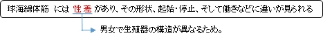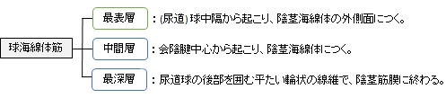 「 【 男 性 】 では球海綿体は尿道球の周辺を不体の筋として回るが、会陰の中心腱と尿道海綿体下側の正中縫線から起こる。球海綿体は前方へ放散し、海綿体のまわり下尿生殖隔膜筋膜や尿道海綿体へ向かい、また前筋線維をもって陰茎背部へ付く。この筋は随意的または反射的に尿道球を圧迫し、それにより尿道の内容を駆出する。