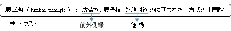 「 変 異 : 個々の筋束に分離することがある.棘突起,腸骨稜および肋骨における筋起始の欠如あるいは増加がありうる(肋骨からの起始部についてはFrey, Vierteljahrsschr. naturforsch, Ges. Zürich 1918参照).腰三角の形は,この筋が腸骨稜から起るぐあいによって異る.肩甲骨下角から出る副筋束は,大体いつも見られる.広背筋停止腱は,大円筋の腱と分けられないことが多い.過剰筋束としては,広背筋の外側縁において非常に不定であるが腱性あるいは筋性の索が 7~8% (W. Krause, Le Double) に見られる.これは広背笏の外側縁から分れてでて,腋窩を超えて,多くは大胸筋腱の後面に終るが,また他の場所にも停止することがある.この筋束に対してランゲル腋窩弓 “Langer-scher Achselbogen” という名称を用いる.