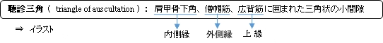 ・ obliquus externus abdominis : 外腹斜筋 ・ rhomboideus major : 大菱形筋 ・ subcutaneous : 皮下の ・ auscultation : 聴診 ・ triangle of auscultation : 聴診三角 ・ intertubercular groove : 結節間溝 ・ teres major : 大円筋 ・ medial lip : 内側唇