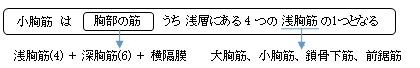 「小胸筋は前胸壁にあり大胸筋で完全に被われており、骨性の第(2)3~5肋骨の腹側端からおこり、肩甲骨の烏口突起に停止している。この筋は大胸筋になるものと同じ原基から発生する。正常では、この筋は上肢帯を胸壁と繋ぐにすぎないが、ときに大結節稜に停止する筋の破格が上肢筋の起始に向かっていることがある。作用は肩甲骨を引き下げる、または肋骨を挙上する呼吸補助筋。神経支配は内側胸筋神経。」