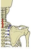 The serratus posterior superior muscle arises by an aponeurosis from the lower part of the nuchal ligament, from the spinous processes of C7, T1, T2, and sometimes T3, and from the supraspinal ligament.[2] It is inserted, by four fleshy digitations into the upper borders of the second, third, fourth, and fifth ribs past the angle of the rib.[2]