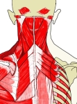 ・ quadrilateral : 四辺形の ・ thorax : 胸郭 ・ rhomboid muscles : 菱形筋 ・ aponeurosis : 腱膜 ・ nuchal ligament : 項靭帯 ・ spinous processes : 棘突起 ・ supraspinal ligament : 棘上靭帯 ・ fleshy : 肉質の ・ digitations : 指状突起 ・ angle of the rib : 肋骨角 ・ respiration : 呼吸
