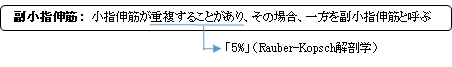 「 変異 : ( 固有小指伸筋の腱の分裂は日本人では男207体側のうち64体側(30.9%),女93体側のうち23体側(24.7%〉(小金井),アイヌ入10体側のうち8体側(佐野)である(小金井良精,新井春次郎,敷波重次郎:東京医学会雑誌17巻,127~131,1903;佐野好:福岡医科大学雑誌,24巻,31~117,1931).):この筋は全く欠如していることがあり,また総指伸筋あるいは尺側手根伸筋の1つの筋束によって代られていることもある.この筋は第5指にはただ1本の腱だけをあたえたり,あるいは2本に分れた腱の1つを第4指に,他の1つを第5指にあたえたりする.またM. extensor digiti minimi accessorius(副小指伸筋)が存在することがある(5%,Krause).」