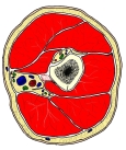 The biceps are one of three muscles in the anterior compartment of the upper arm, along with the brachialis muscle and the coracobrachialis muscle, with which the biceps shares a nerve supply.[1] The biceps muscle has two heads, the short head and the long head, distinguished according to their origin at the coracoid process and supraglenoid tubercle of the scapula, respectively.[1] From its origin on the glenoid, the long head remains tendinous as it passes through the shoulder joint and through the intertubercular groove of the humerus.[2] Extending from its origin on the coracoid, the tendon of the short head runs adjacent to the tendon of the coracobrachialis as the conjoint tendon. Unlike the other muscles in the anterior compartment of the arm, the biceps muscle crosses two joints, the shoulder joint and the elbow joint.