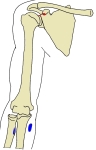 - Proximal radioulnar joint of the elbow – The biceps brachii functions as a powerful supinator of the forearm, i.e. it turns the palm upwards. This action, which is aided by the supinator muscle, requires the humeroulnar joint of the elbow to be at least partially flexed. If the humeroulnar joint, is fully extended, supination is then primarily carried out by the supinator muscle. The biceps is a particularly powerful supinator of the forearm due to the distal attachment of the muscle at the radial tuberosity, on the opposite side of the bone from the supinator muscle. When flexed, the biceps effectively pulls the radius back into its neutral supinated position in concert with the supinator muscle.:346–347