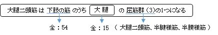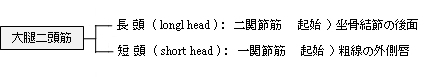 「大腿二頭筋は2関節性の長頭と1関節性の短頭から成る。長頭は坐骨結節で半腱様筋と総頭をつくって起こる。短頭は粗線の外側唇の中1/3と外側筋間中隔から起こる。これら両頭は合して2頭筋となり、腓骨頭に終わる。その際この筋と膝関節の外側側副靱帯との間に大腿二頭筋の下腱下包がある。股関節では長頭は大腿を後斜するように働く。膝関節では大腿二頭筋は屈曲するように働き、屈曲した状態では下腿を外旋する。この筋は膝関節における唯一の外旋筋であって、すべての内旋筋に匹敵する作用をもっている。」