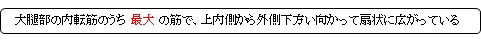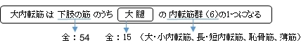 「大内転筋は内転筋群の中で最強、人体中最大の筋の1つである。他の内転筋の背側、恥骨下枝および隣接する坐骨枝から坐骨結節までを起始とする。他の起始をもつ部分はほとんどが粗線内側唇に筋性停止する。」