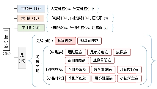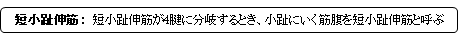 「短趾伸筋は踵骨の上端および下伸筋の支帯より起こり第2~4趾、ときには第2~5趾(約8%)の背側腱膜へ至る。この筋の4本の腱はいずれも前内側に進むが、そのうち最内側のもの(ときに 短母指伸筋腱 extensor hallucis brevis tendon ともよばれる) は第1趾の基節底に停止する残りの3本の腱はそれぞれ第2,第3、第4趾に向かう長指伸筋腱への合流を示す。短趾伸筋は深腓骨神経の支配を受ける。この筋は第1~4趾を伸展させる。この筋の作用は距腿関節で足が背屈して長指伸筋が動けない状態下で特に顕著となる。」