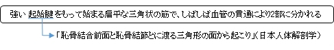 「長内転筋は恥骨結合の線維軟骨および恥骨稜直下の狭い領域から長い腱として起こる。遠位で広くなり、薄い幅広の腱となって粗線(内側唇)の中1/3に停止する。停止腱の遠位縁をつくる筋束は広一内転筋板の形成に多少なりとも参加し、内転筋管の入り口をかたちづくる。」