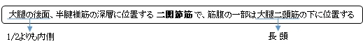 「半膜様筋は大腿二頭筋長頭と大腿方形筋の起始の間の坐骨結節から起こる。脛骨内側顆、膝関節包後壁および膝窩筋の筋膜に停止する。半膜様筋は中4分の2のみが筋性である。起始腱は広い腱性の板をなし、停止腱も同じ平板である。3本の腱様の索として終わる。脛骨への索は腹側で迂回し、内側側副靱帯の下の脛骨内側顆に付く。中央の索は筋の方向を受け継ぎ、一部は脛骨近位端後面に、一部は膝窩筋の筋膜に付く。腓骨への索は膝関節包の後壁を補強し、斜膝窩靱帯として大腿骨外側顆に向かって外側へ射創する滑液包が通常同筋の停止腱と脛骨内側顆の間にある。」
