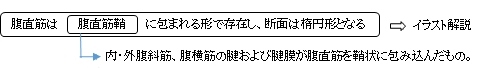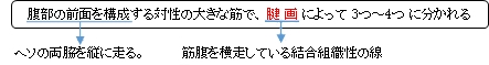 「 断面が楕円形のこの筋の停止腱から分かれた線維は、正中線を越え、白線の尾側への続きとして恥骨結合から陰茎(陰核)の背側面に向かう陰茎(陰核)提靱帯に加わる。腹直筋が強く働くのは背臥位から状態を起こすとき、ボートを漕ぐときなどである。腹筋の発達した人では腱画の位置が皮膚の上からくぼんで見える。 」