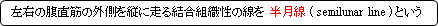 ・ abdomen : 腹部 ・ connective tissue : 結合組織 ・ linea alba : 白線 ・ pubic symphysis : 恥骨結合 ・ pubic crest : 恥骨稜 ・ pubic tubercle : 恥骨結節 ・ xiphoid process : 剣状突起 ・ costal cartilages : 肋軟骨 ・ proximal : 近位の ・ sternum : 胸骨 ・ rectus sheath : 腹直筋鞘 ・aponeuroses : 腱膜 ・ tendinous intersections : 腱画 ・ distinct : 明瞭な ・ linea semilunaris : 半月線 ・ externally : 外面的に