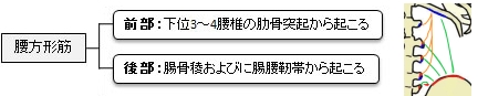 【 起 始 】 : 前部 : 第2(又は3)から第5腰椎の肋骨突起