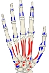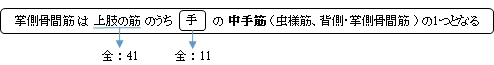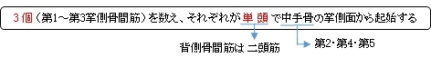 【 停 止 】 : それぞれ起始する中手骨と同じ側で、すぐ上の基節骨に停止する。また、一部は指背腱膜に停止する。