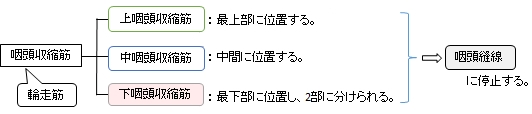 ・咽頭の筋層に見られる筋群は大きく縦走筋と輪走筋に分けることができる。そして、咽頭収縮筋は、咽頭部を収縮させる(狭める)縦走筋となる。