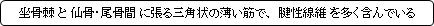 「尾骨筋は腱性の束をまじって坐骨棘から起り,扇状にひろがって尾骨の側縁に付着している.腱性の成分がきわめて多量であって,そのためにこの筋は仙棘靱帯の一部のようにみえることがある.この筋はまったく欠けていることがある.」