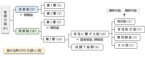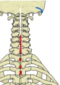 ・ thorax : 胸郭 ・ nuchal ligament : 項靭帯 ・spinous process:棘突起 ・cervical vertebra:頚椎 ・thoracic vertebrae:胸椎 ・sternocleidomastoideus:胸鎖乳突筋 ・mastoid process:乳様突起 ・temporal bone:側頭骨 ・trapezius:僧帽筋 ・posterior triangle of the neck:後頚三角 ・posterior ramus of spinal nerves:脊髄神経後枝