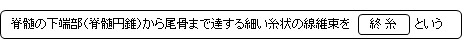 「脊髄は、長さ約40~45㎝の細長い索状物で脊柱管の中にある。」(日本人体解剖学 (上巻) )    「上方は後頭骨および環椎の境で延髄に連なり、下端は第1~第2腰椎の高さで急激に細くなり円錐状となって終わる(脊髄円錐)」(日本人体解剖学 (上巻):改)					                      「脊髄の下端部は下方に向かった円錐を作り、脊髄円錐と呼ばれ、その先端からさらに16cm位の細いひもが下り、尾骨の後面につく。これを終糸といい、元来の脊髄の延長部であるが、大部分軟膜から成り、上端部は痕跡的な脊髄を含む。」(船戸和弥のホームページ)					                     ・胸髄:「胸髄では前後径約8㎜、左右径約10㎜である」(日本人体解剖学 (上巻) )