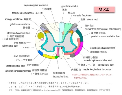 「 脊髄の横断面で内部構造を観察すると、脊髄が灰白質および白質からできていることは脳と同様であるが、その位置的関係は脳とは逆である。すなわち、周辺部は白質、中心部はH字形の灰白質が占めている。白質ならびに灰白質の形は脊髄の部位によって多少異なる。 」( 日本人体解剖学 ( 上巻 ) )