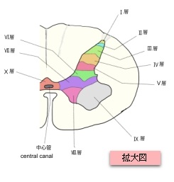 | I層 | 脊髄後角の表層:辺縁層 | ・主に侵害刺激(痛み)や温度感覚を受け取る一次求心性線維がシナプスする領域