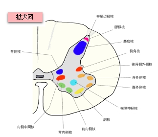 |  | 背内側核 dorsomedial nucleus | 場所:脊髄側角のやや背側寄り(dorsomedial = 背内側) 役割:                                            自律神経前ニューロンの一部(特に交感神経)を含むことがある。  内臓感覚や自律神経出力の統合に関与  特徴:				                            intermediomedial nucleus や intermediolateral nucleus に隣接                                             主に中間灰(Rexed VII層)に位置  |