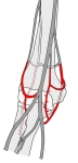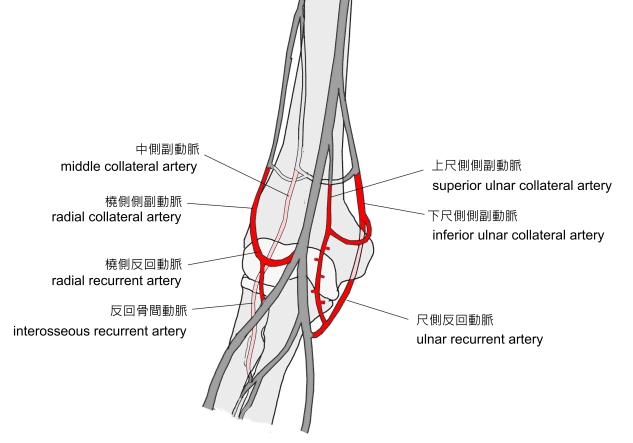 「 肘関節動脈網は肘関節包の前面・後面に分布する枝によってつくられる動脈網で、ことに関節後面でよく発達している。これに関与する動脈は、主として上腕骨の内側および外側上顆の前面と後面を経て分布するがこれには上腕動脈の枝(上および下尺側側副動脈、中側副動脈、橈側側副動脈)、尺骨動脈の枝(尺側反回動脈の前枝および後枝、反回骨間動脈)、橈骨動脈の枝(橈側反回動脈)などがある。 」