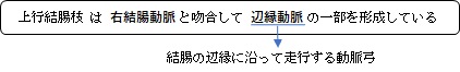「 回結腸動脈の結腸枝は右結腸動脈の枝と吻合し、上行結腸に伴って上行する回結腸動脈の下枝の枝で上行結腸に分布する。」