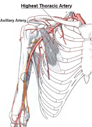 「The superior thoracic artery ( highest thoracic artery ) is a small artery located near the armpit in humans. It normally arises from the first division of the axillary artery, but may arise from the thoracoacromial artery, itself a branch of the second division of the axillary artery.