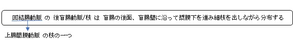 後盲腸枝 ( 回結腸動脈の枝 ) ( こうもうちょうし、 英 : posterior cecal branch ) ・概 要 ・参考となるサイト 吻合:前盲腸動脈、回腸枝 ・「 前盲腸動脈よりもやや深部を走る傾向があります。 」(ChatGP) 以下は回結腸動脈の枝を簡単に表したものとなる。 回結腸動脈 の枝(模型図) 上腸間膜動脈 の枝(模型図) 上腸間膜動脈 の分布(前面) 【 イラスト掲載サイト 】 ・ イラストや写真を掲載しているサイト-Ⅰ ・ イラストや写真を掲載しているサイト-Ⅱ ・ イラストや写真を掲載しているサイト-Ⅲ ・ イラストや写真を掲載しているサイト-Ⅳ ・ イラストや写真を掲載しているサイト-Ⅴ