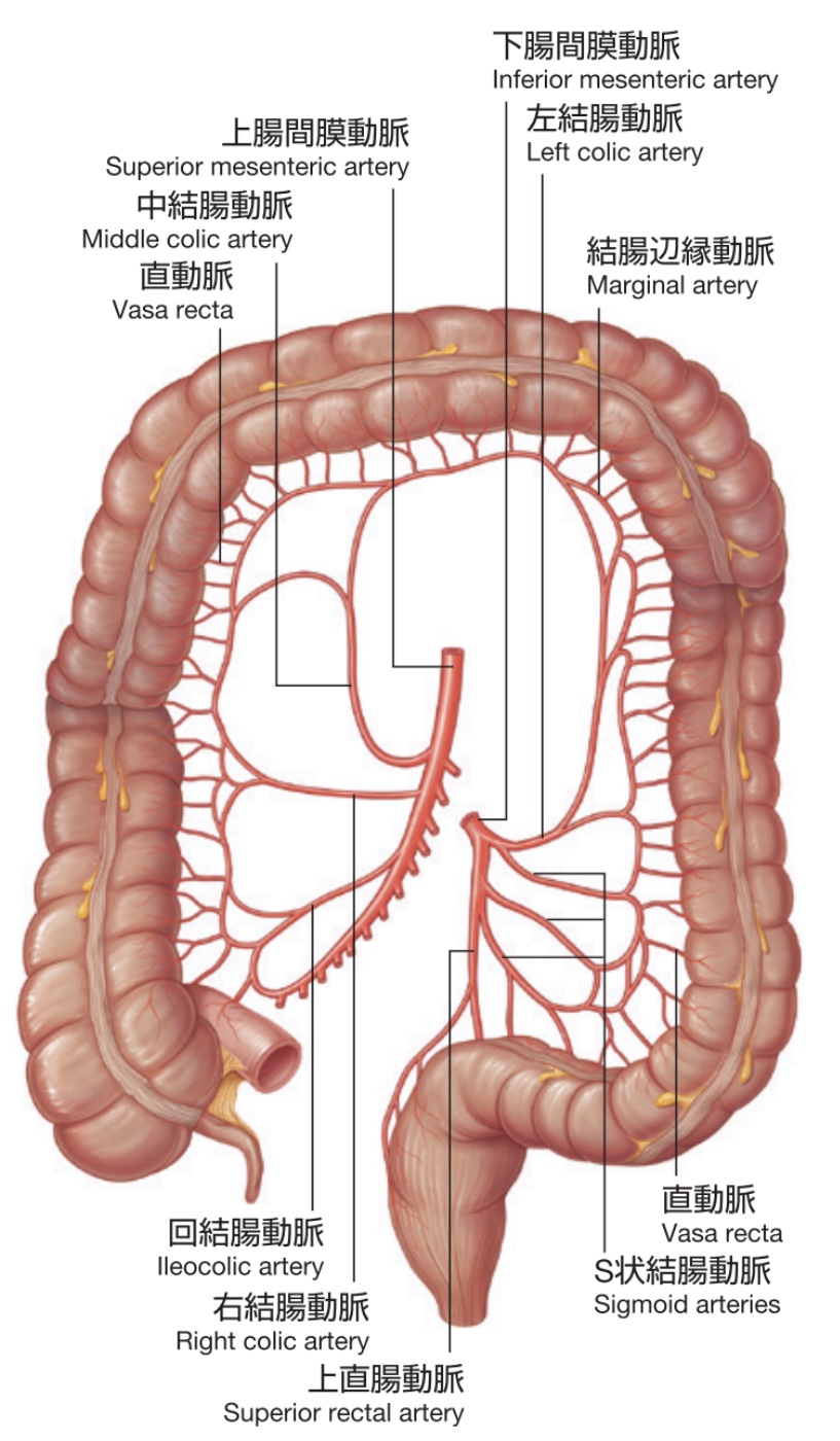 - 大腸でも同様に動脈弓から直動脈が伸び、腸管壁に分布します。