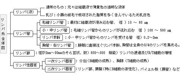 私たちの身体を構成する細胞の回りには組織液(または間質液)と呼ばれる液体が存在している。この組織液は血液の血漿成分が毛細血管からしみ出たもので、その多くはもとの毛細血管に戻っていくが、10%ほどの組織液はリンパ管に流れ込みリンパ(lymph)となってリンパ管の中を流れる。 このリンパの流れる経路を「リンパ系」と呼び、以下のような構成要素が挙げられる。
