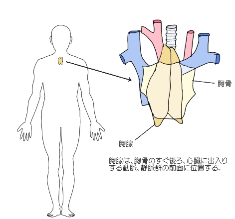 胸腺は、胸骨のすぐ後ろ、心臓に出入りする動脈、静脈群の前面に位置する。