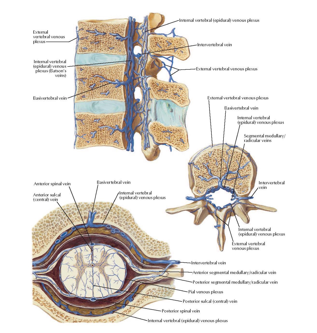 「 前内椎骨静脈叢および後内椎骨静脈叢は脊柱管の内部で、脊髄硬膜と骨との間にあり、主として縦走する前後各2条の静脈よりなる。前内椎骨静脈叢は、椎体および椎間円板の後面にあり、後縦靱帯の両側を縦走する。後内椎骨静脈叢は、椎弓の前面で正中線の両側を縦走する。これらの静脈は脊柱管内で互いに交通枝、脊髄硬膜の外面と骨との間にあって脊髄をとりかこむ血管輪をなす。一般に外椎骨静脈叢よりも密に発達している。頭蓋における脳硬膜静脈洞に相当する。」