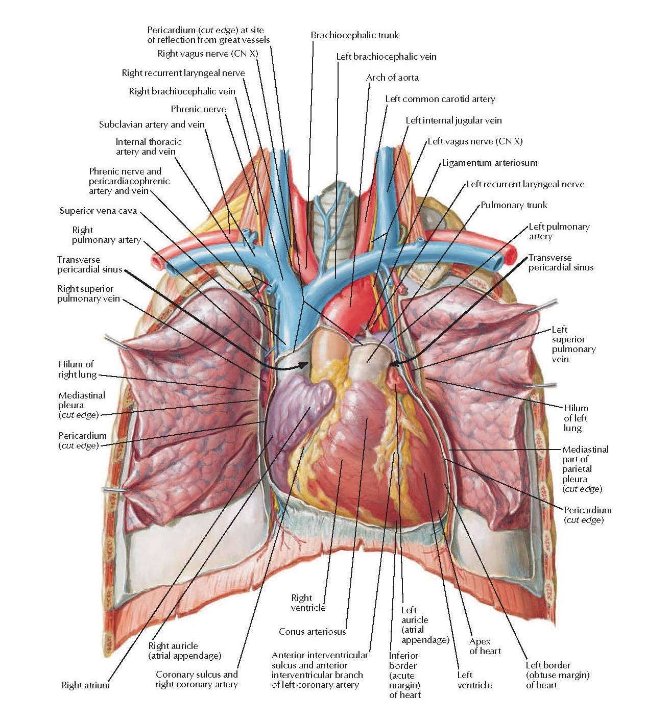 These veins merge to form the superior vena cava, a great vessel, posterior to the junction of the first costal cartilage with the manubrium sternum.