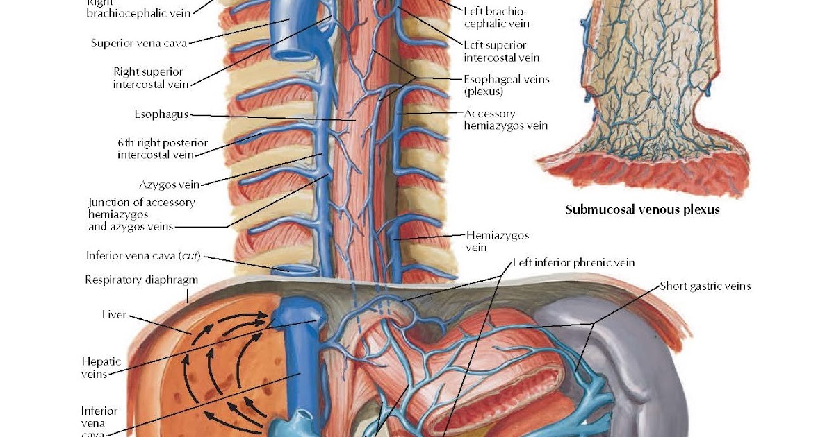 「 The esophageal veins drain blood from the esophagus to the azygos vein, in the thorax, and to the inferior thyroid vein in the neck. It also drains, although with less significance, to the hemiazygos vein, posterior intercostal vein and bronchial veins.