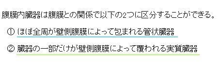 腹腔内臓器( ふくくうないぞうき、英:abdominal organs ) ・概 要 ・一覧表 ・参考となるサイト 【概 要】 腹部の臓器は以下のように腹腔内に存在するものと後腹膜(腹腔の後部の空間)に存在するものに分かれる。 【一覧表】 臓器名 分 類 腹膜被覆 備 考 1 胃 腹膜内 ほぼ全周 胃脾間膜、胃横隔膜間膜 2 空 腸 ほぼ全周 腸間膜 3 回 腸 ほぼ全周 腸間膜 4 盲 腸 ほぼ全周 多くの場合間膜無、 例外)盲腸間膜 5 虫 垂 ほぼ全周 虫垂間膜 6 横行結腸 ほぼ全周 横行結腸間膜 7 S状結腸 ほぼ全周 S状結腸間膜 8 脾 臓 ほぼ全周 胃脾間膜、脾腎間膜 9 肝 臓 腹膜内 (例外型) 大部分 裸区域(後上部)あり 10 胆 嚢 部分的 上面(肝床)は腹膜なし 11 十二指腸 (第1部:球部) 部分的 腹膜内 前・後両面 殆どは(第2~4部)は二次性後腹膜臓器 12 直腸 (上/中部) 部分的 上部(前面・側面)、中部(前面のみ)が腹膜で覆われ、それ以外は腹膜下臓器となる。 膵臓(尾部)