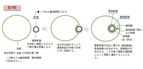 ・peritonea:腹膜、peritoneumの複数形 ・coelomic cavity:体腔 ・embryo:胚 ・pleural cavities:胸膜腔 ・pericardial cavity:心膜腔