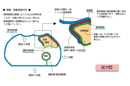 「腹膜は、漿膜と結合組織である漿膜下組織からなる。漿膜は単層扁平上皮細胞からなる極めて薄い層であり、肉眼的にはその下にある漿膜下組織まで含めて腹膜として扱っている」