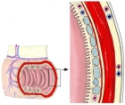 Peyer's patches are observable as elongated thickenings of the intestinal mucosa measuring a few centimeters in length. About 100 are found in humans. Microscopically, Peyer's patches appear as oval or round lymphoid follicles (similar to lymph nodes) located in the mucosa layer of the ileum and extend into the submucosa layer. The number of Peyer's patches peaks at age 15–25 and then declines during adulthood.[2] In the distal ileum, they are numerous and they form a lymphoid ring. At least 46% of Peyer's patches are concentrated in the distal 25 cm of ileum in humans. It is important to note that there are large variations in size, shape, and distribution of Peyer's patches from one individual to another one.[6] In adults, B lymphocytes are seen to dominate the follicles' germinal centers. T lymphocytes are found in the zones between follicles. Among the mononuclear cells, CD4+/CD25+ (10%) cells and CD8+/CD25+ (5%) cells are more abundant in Peyer's patches than in the peripheral blood.[7]