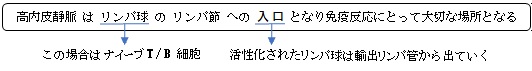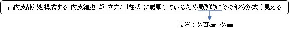 通常の平坦な静脈内皮と異なる。リンパ球の血流から組織への移行を助ける。 |