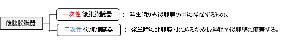 以下が一次性後腹膜臓器の一覧になるが、脈管・神経は含めていない。
