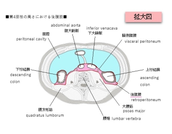 以下は第4腰椎の高さにおける後腹膜の領域をピンクで表してみた。腹腔の領域は高さによって収まる臓器が異なるためかなり異なる。
