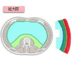 以下の左のイラストは第4腰椎の高さにおける後腹膜の領域をピンクで表してみた。腹腔の領域は高さによって収まる臓器が異なるためかなり異なる。