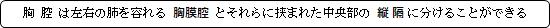 胸 腔( きょうくう、英:thoracic cavity ) 以下は体腔を簡単に記した全体図となる。 【参考になるサイト】 ・イラストや写真を掲載しているサイト-Ⅰ ・イラストや写真を掲載しているサイト-Ⅱ ・イラストや写真を掲載しているサイト-Ⅲ